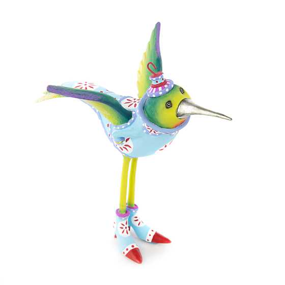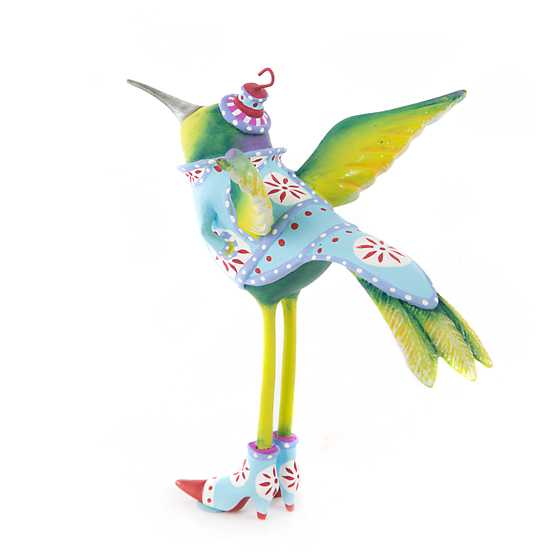 The Patience Brewster Dinger Hummingbird Ornament coordinates with her mate, Hummie, in her powder blue swallowtail jacket (with pockets), hat, and mid-heel booties. The female hummer chose red for the tips of her toes. She has a little cap, a pewter beak, and ultramarine and green wings like all four hummingbirds in her Woodland collection family.