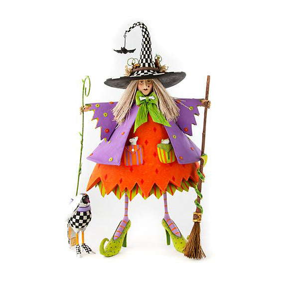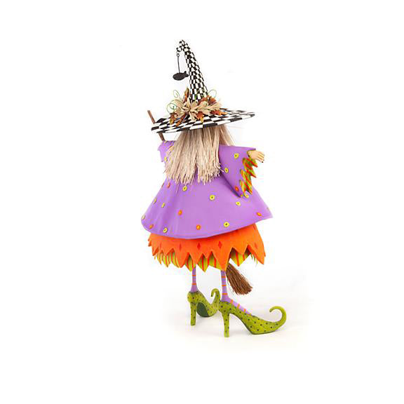 The Patience Brewster Raggedy Witch Figure has spooky autumn style that extends from her checked hat with a tiny bats to her chartreuse high heels. She wears a raggedy outfit in layers of chartreuse, orange, and purple, and carries her pet crow and her ever-handy broom. She will magically complete your halloween display!