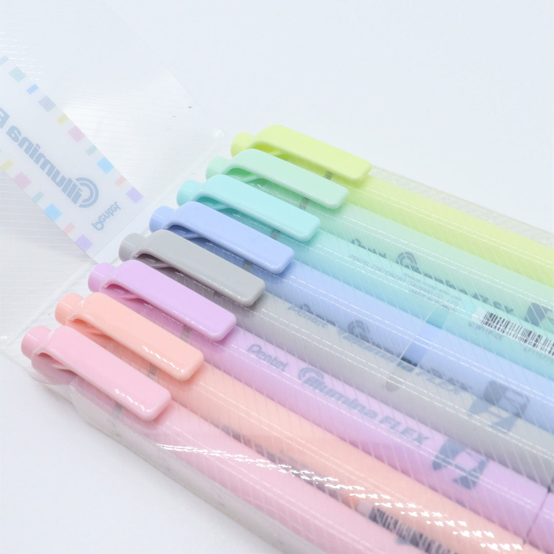 PENTEL's Illumina Flex Twin Tip highlighter features two choices to write with. The fine bullet tip and the special chisel tip. They are great for anyone who is looking for more controlled strokes in different sizes for their notes, journaling, and other craftwork. The highlighters are refillable and are a great choice for color-coding your notes or other highlighting necessities. Pastel colors: Orange, Blue, Yellow, Skyblue, Grey, Pink, Green, Violet