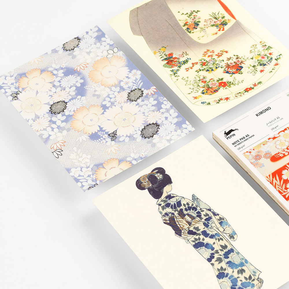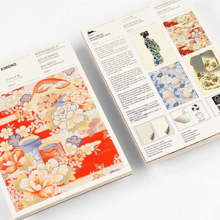 PEPIN Note Pads (A5) contain 64 sheets of heavy (120 g/m2) premium ivory paper; 32 sheets are ruled and 32 are blank. This note pad is great for anyone who enjoys diving deeper into Japanese culture and admires the beautiful floral design of kimonos.
