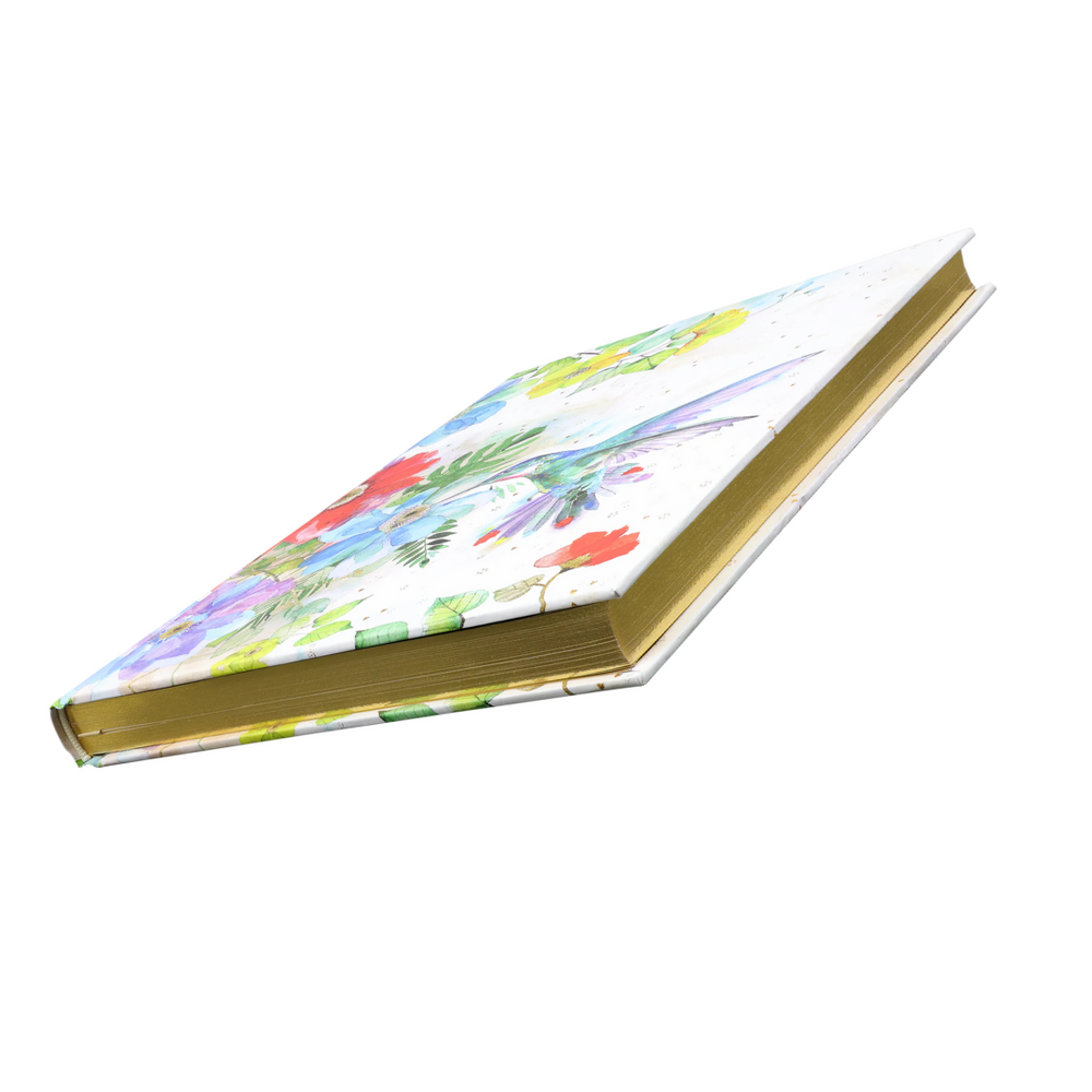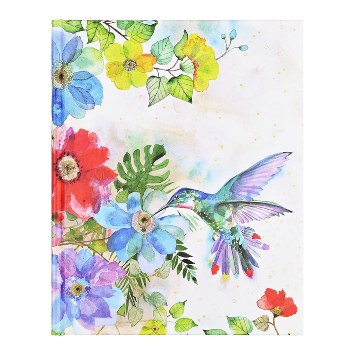 A radiant hummingbird hovers amid a lush garden of blooms on the covers of this gorgeous journal.