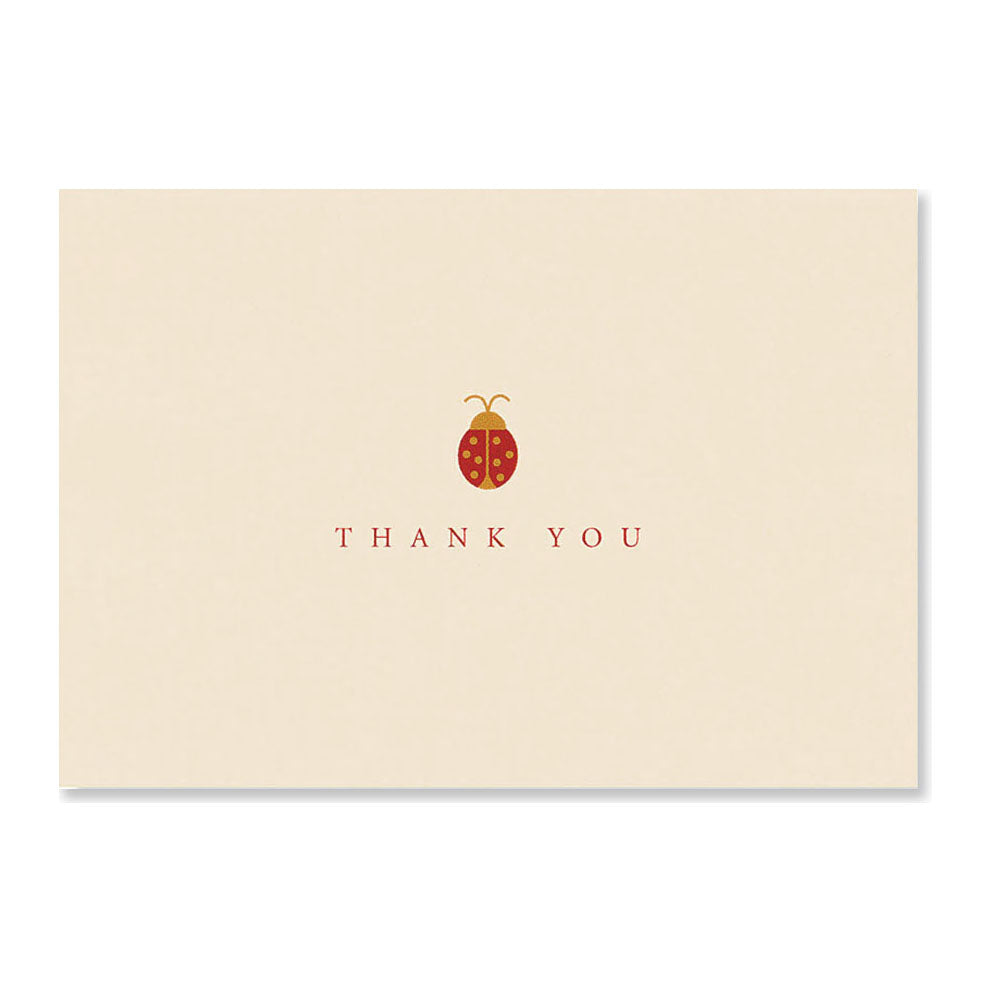 Design features a whimsical ladybug sitting on an ivory background, above the words ''Thank you.''