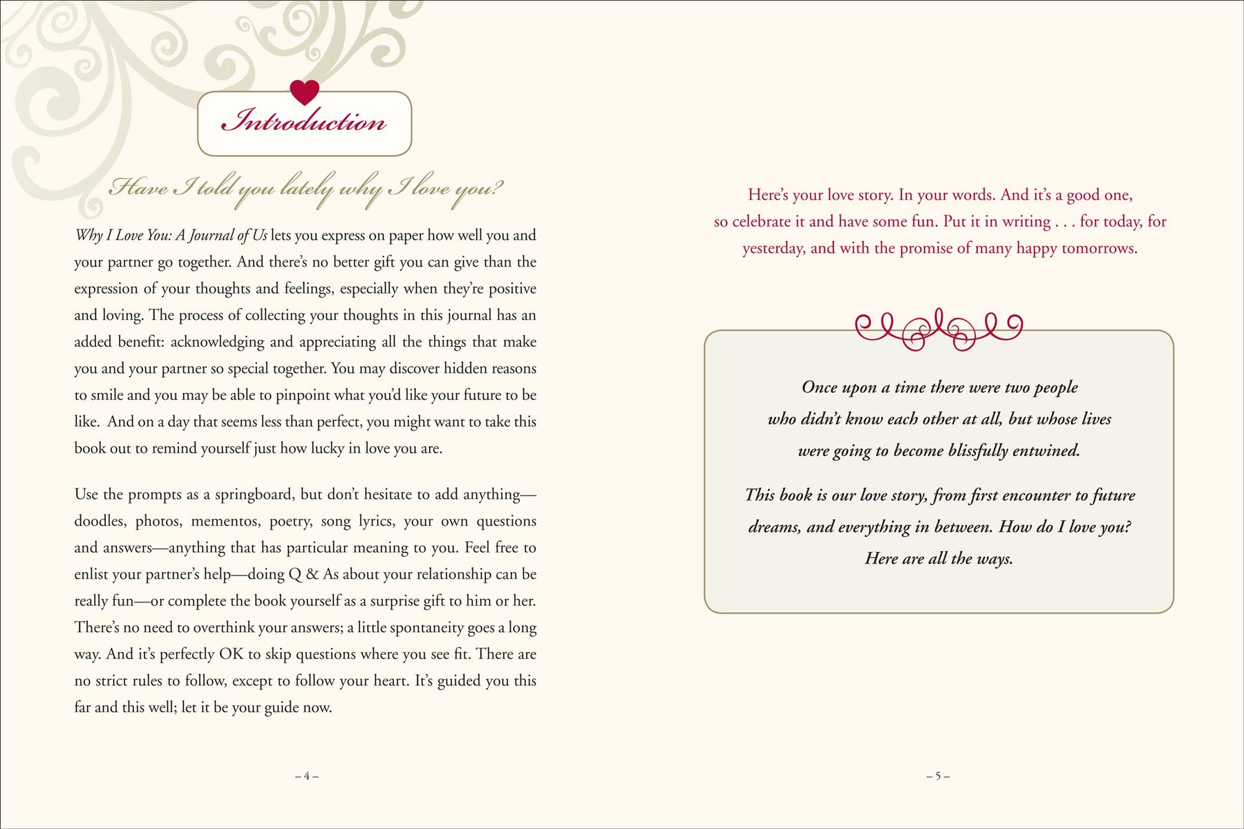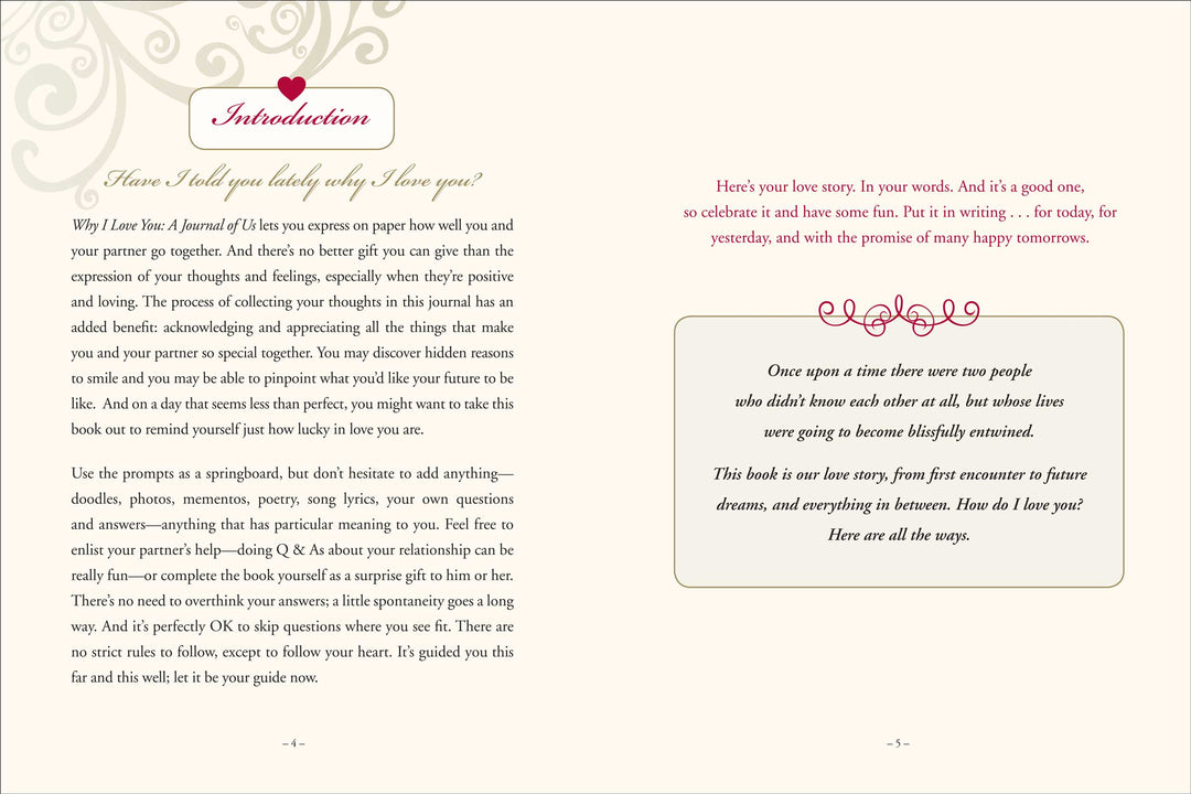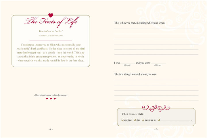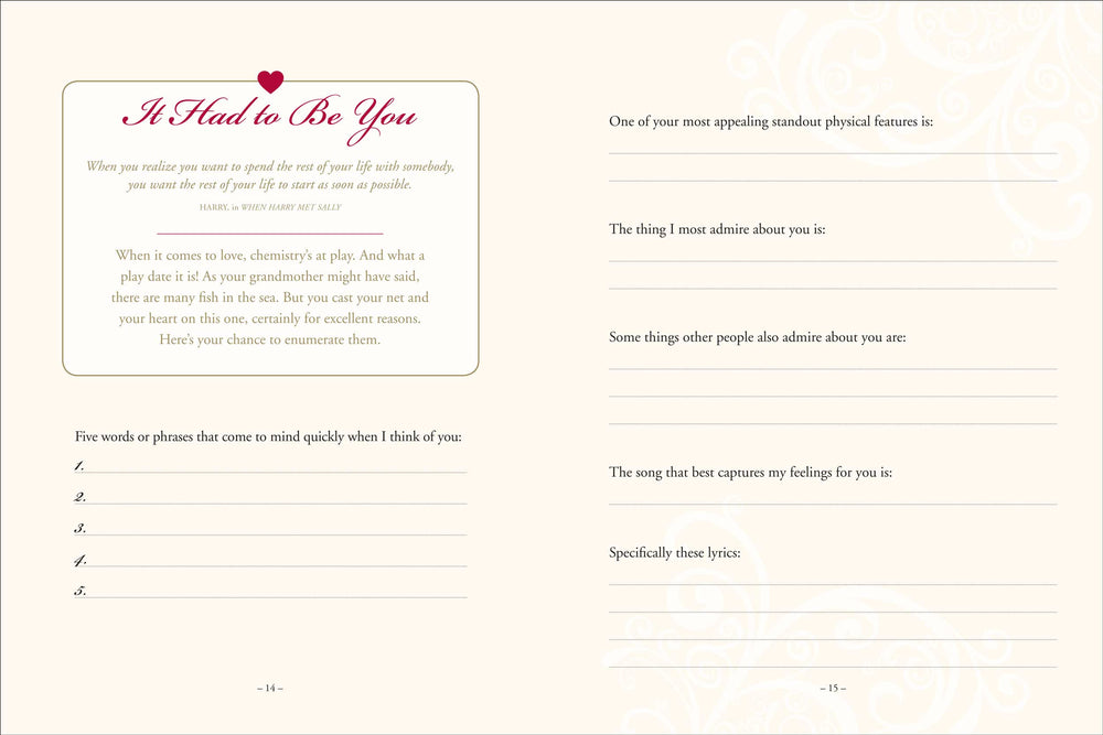 Designed to be filled out by one partner and given to the other, or to be explored as a couple, the prompts and questions in this guided journal offer up insight and fun as you write your love story in your own words! DETAILS: