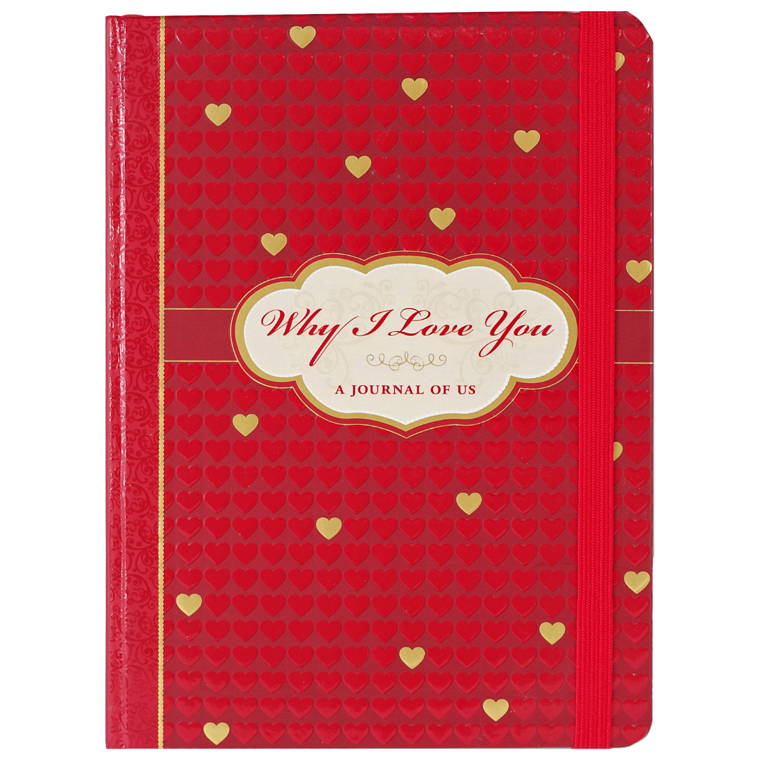 Pretty red journal design features raised embossing, glossy heart design highlights, and gold foil accents.