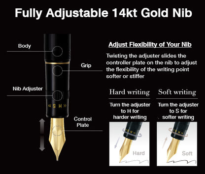 This Pilot Justus 95 fountain pen features a convertible solid 14kt gold nib that can be adjusted to softer to stiffer writing point by turning the tension adjuster next to the grip. Comes in Elegant Gift Box This pen is perfect for a gift. As the nib flexibility is adjustable, it fits to wide range of writing preferences. Adjust flexibility of your nib Twisting the adjuster slides the controller plate on the nib to adjust the flexibility of the writing point softer (Turn the adjuster to H) or stiffer (Turn the adjuster to S).