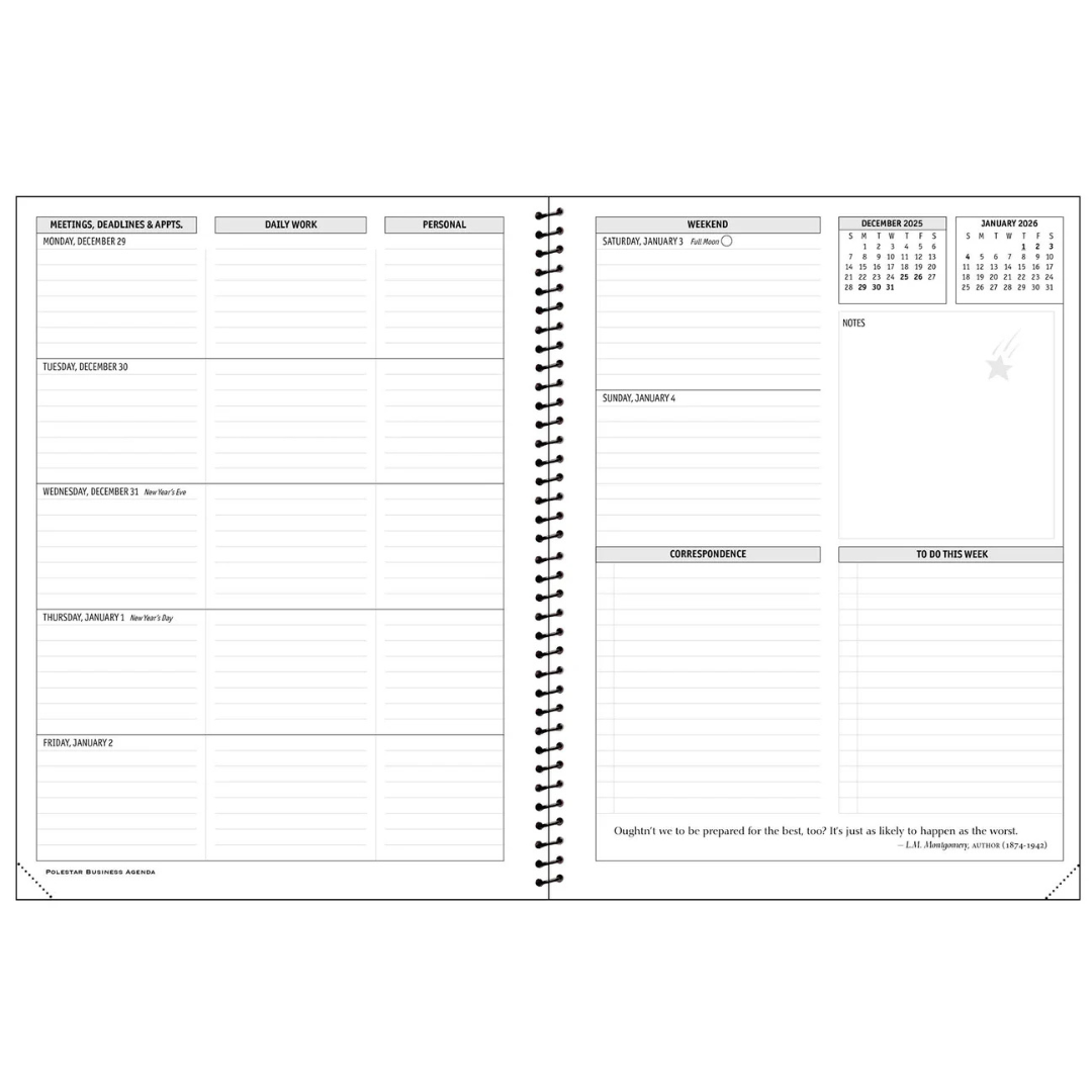 • Unique three-part time-management system including columns for Meetings/Deadlines, Daily Work and Personal