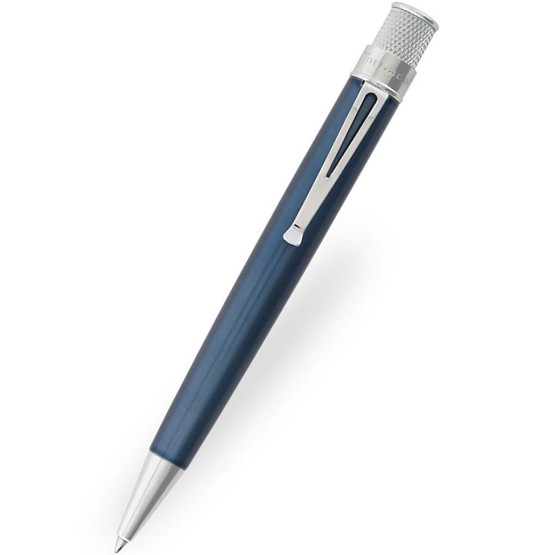Inspired by the vintage aesthetic of mid-century Americana, the Retro 51 Tornado rollerball pen is a must-have for any stationery collection. Utilizing a capless rollerball refill the pen glides effortlessly across the page, whilst the twist action cap has knurled detailing for additional grip. The broad profile and pleasing weight make using the Tornado a real joy. Constructed from sturdy stainless steel and completed with Ice blue lacquer and chrome plated trim, the pen has a classic and professional appeal. As Retro 51 says “Life is too short to carry an ugly pen!