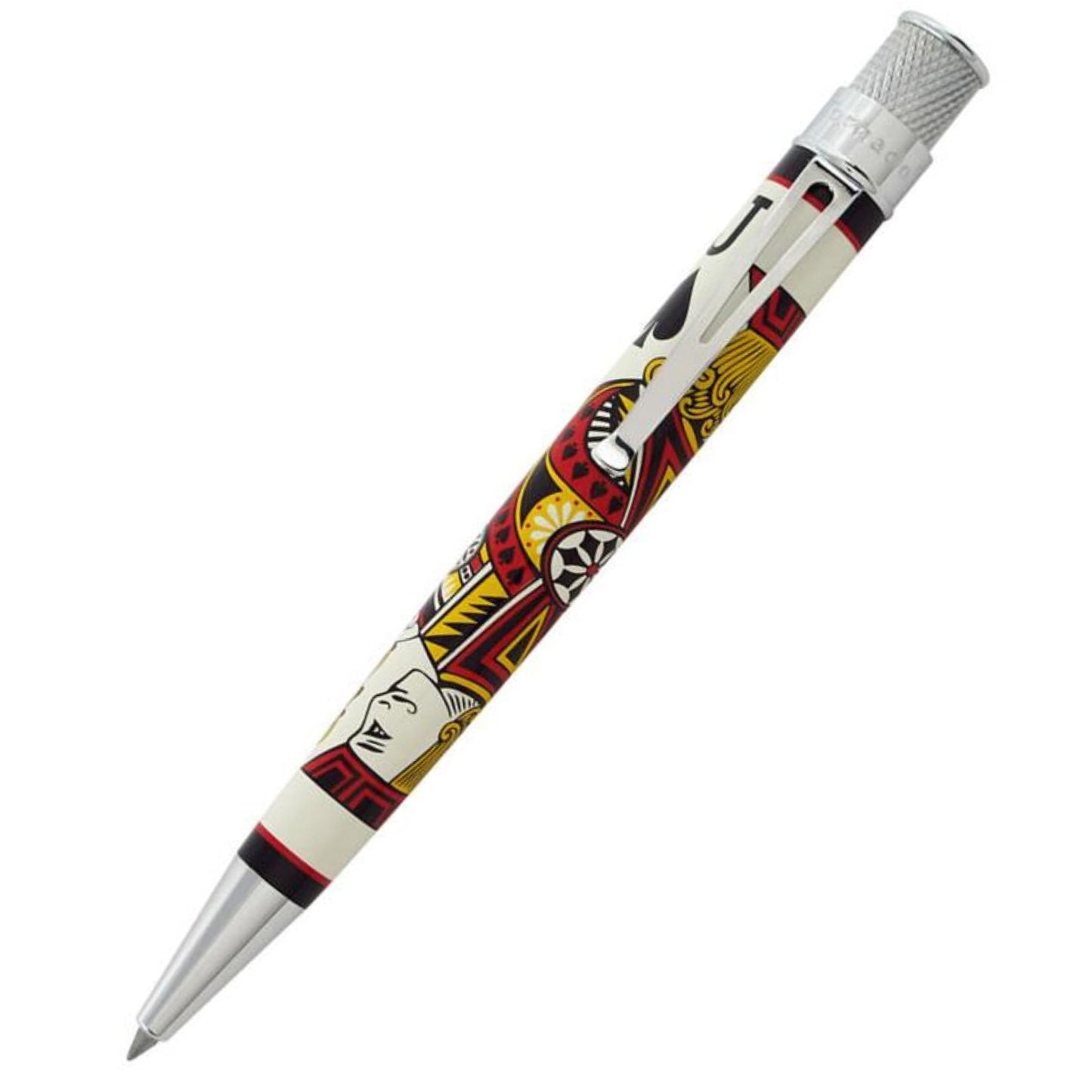 The Retro 51 Jack of Spades rollerball pen features a Jack playing card design with antique silver accents. The pen uses a twist mechanism and comes in packaging with a similar design as the pen.