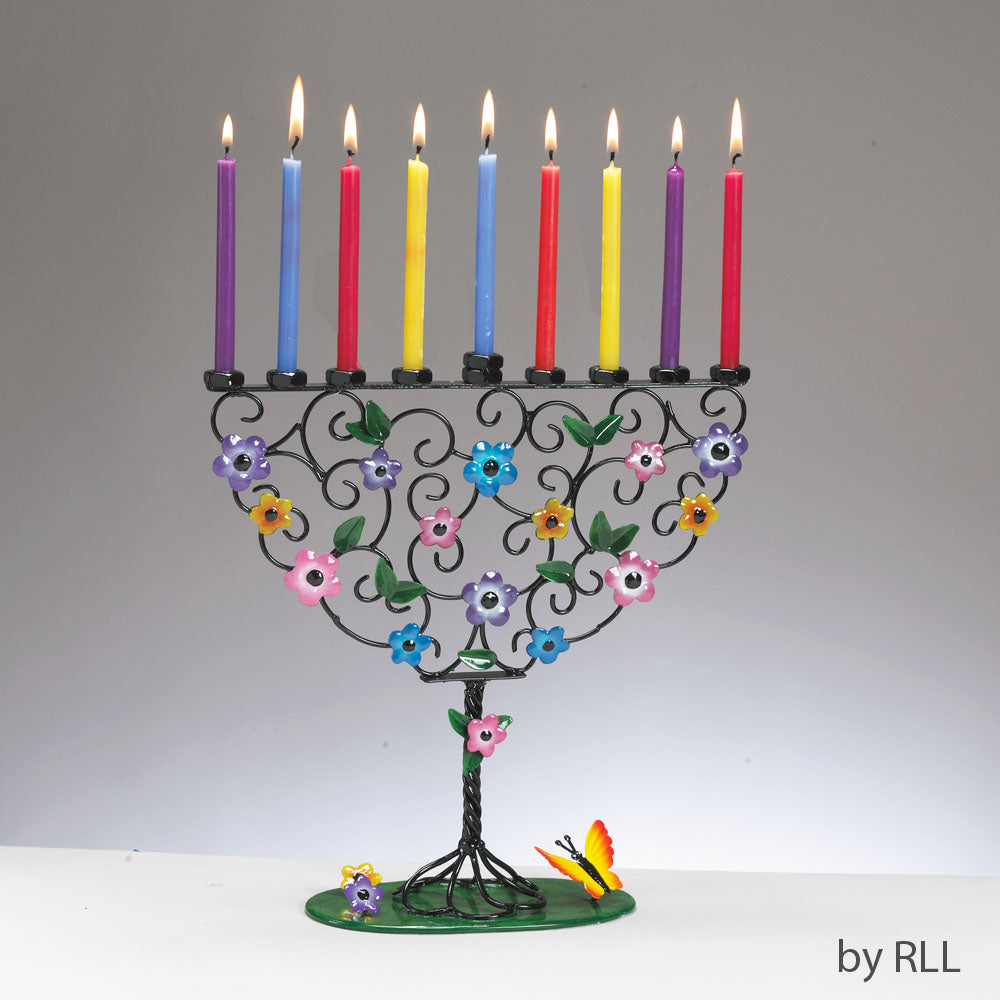Vivid colors painted upon this handcrafted Menorah exude happiness! Your colorful Candles will come to life atop this tree Menorah, constructed of hand-crafted metal. Beautifully blends into every environment.