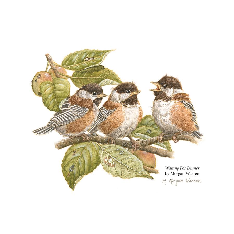 Alongside the artist's studio an old crabapple tree grows.  As well as fruit, it also provides shelter for many birds, including this trio of fluffy Chestnut-backed Chickadees, which are still being fed by their parents.  In this painting, they have just spied mother or father winging in with their next meal.