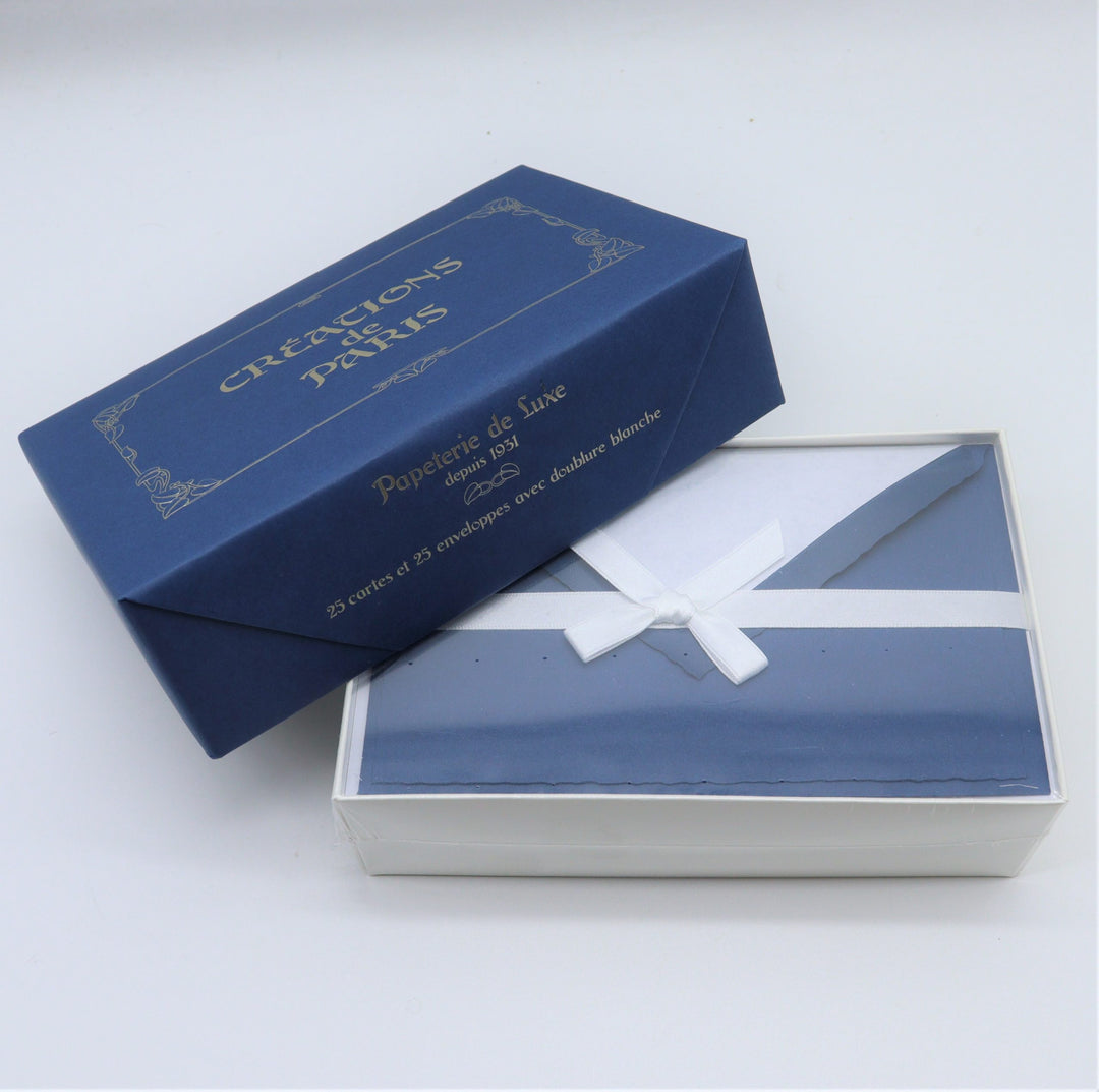 Luxurious "Création de Paris" stationery is the perfect canvas for expressing your sentiments in a memorable way. Elegantly understated, it speaks for itself with a deckled edge and 290 gsm heavy card stock all presented in an "Art Deco" handmade and hot-stamping print gift box.