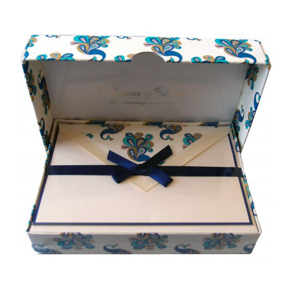 Boxed 10 navy bordered cards and 10 lined envelopes