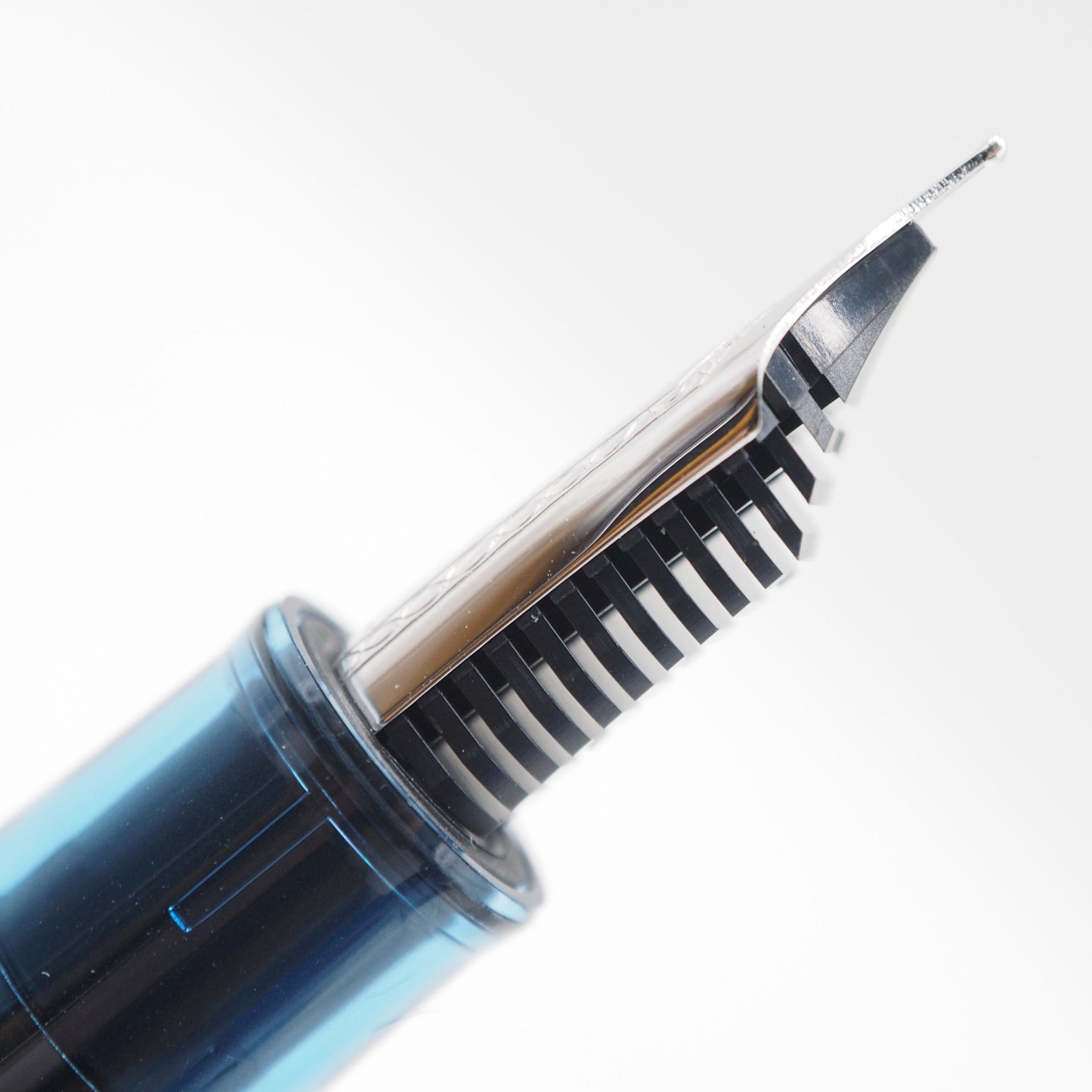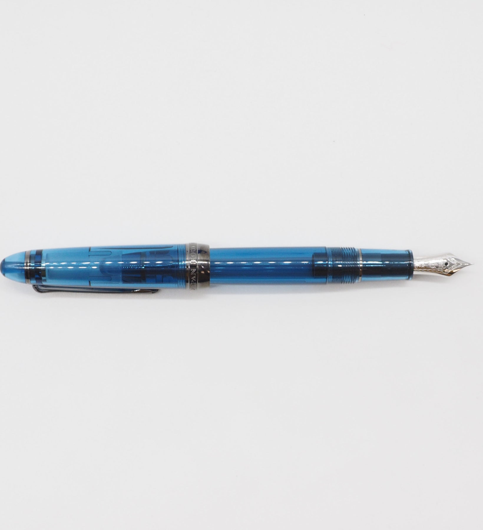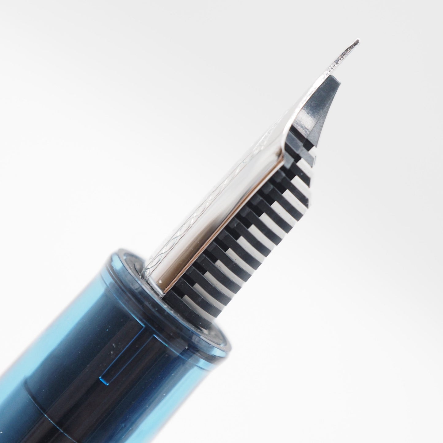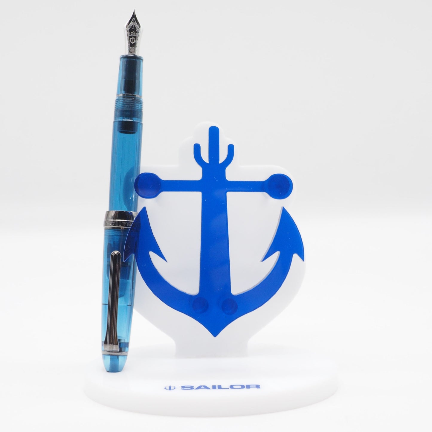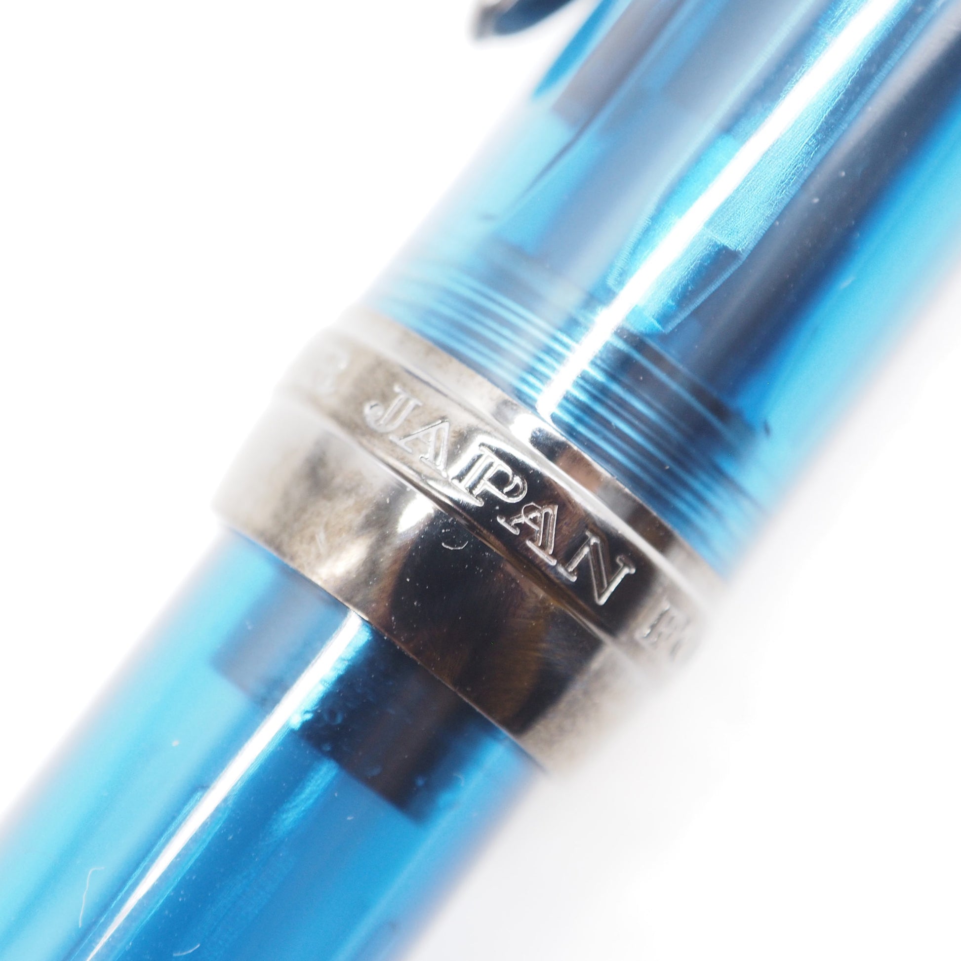 This Sailor 1911S fountain pen features a transparent blue body and cap with black ion-plated trim; the design depicts one's state of mind at 4 in the morning.