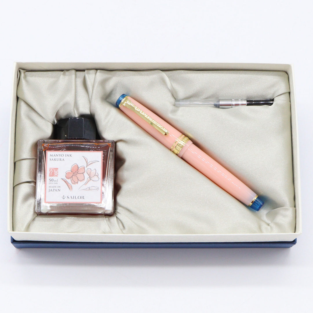 Include: Sailor fountain pen converter, 50 ml bottled Manyo Sakura ink and Sailor gift box