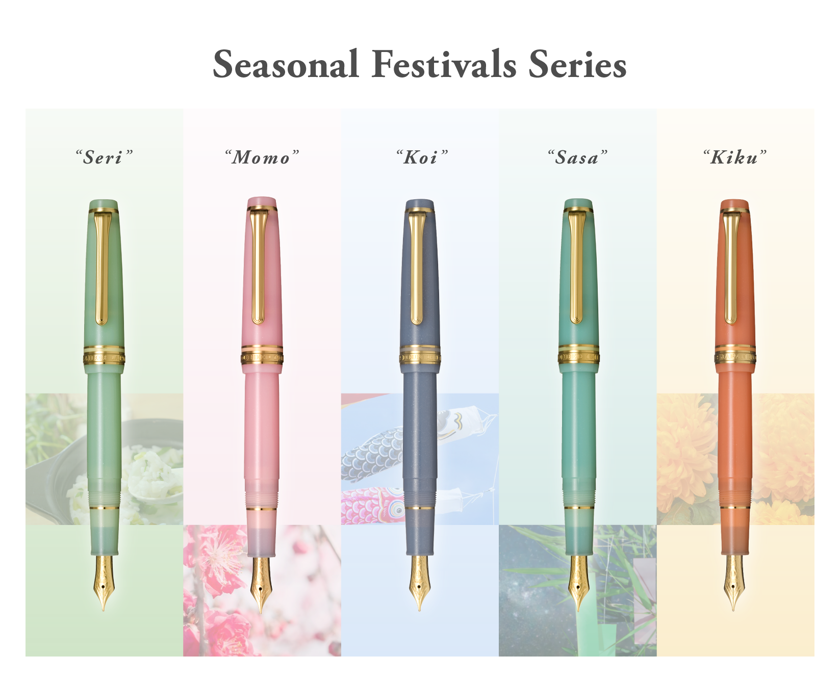 For April 2022, Sailor Pen releases the "Seasonal Festivals" Series - A collection of 5 unique fountain pens, each honoring a special seasonal, annual event in Japanese Culture with ceremonies unique to each. The pen is presented in an elegant gift set. Carefully packaged to include a matching 20ml bottle of ink from the Sailor Shikiori Ink series and a Sailor cartridge converter. The Koi color comes with a matching shade of Shimoyo ink.