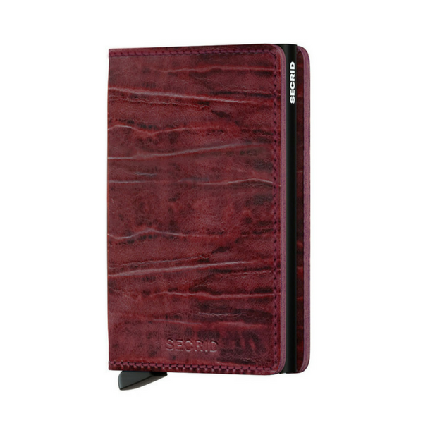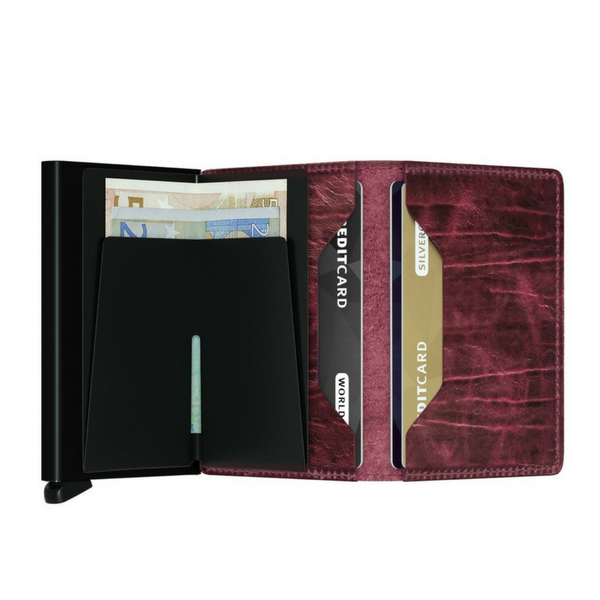 The Slimwallet is a sleek version of the iconic Secrid Miniwallet, but with no press stud closure. It's leather is cut wider than that of the Miniwallet, thereby providing ample space for extra cards, bills, business cards, and receipts. The aluminum case protects cards from bending and unwanted wireless scanning.