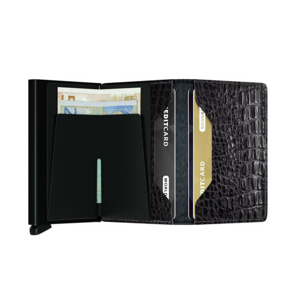 The iconic Secrid Nile Black Slim Wallet is the slimmest, compact, stylish, and secure wallet. Secrid has personalized slim wallets that are available in a wide variety of colors & styles. Even though the wallet is slim, there is ample space for cards, paper money, receipts, and business cards. The patented cardslide mechanism of Slim wallet allows you to access your cards in one simple and smooth motion. Every secrid slim wallet has an aluminum casing that protects your credit card information and privacy and keeps you safe from digital pickpockets.