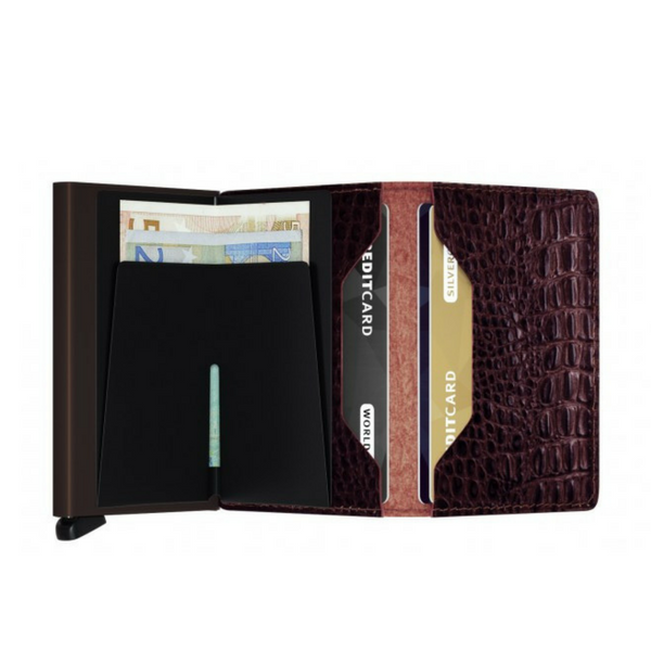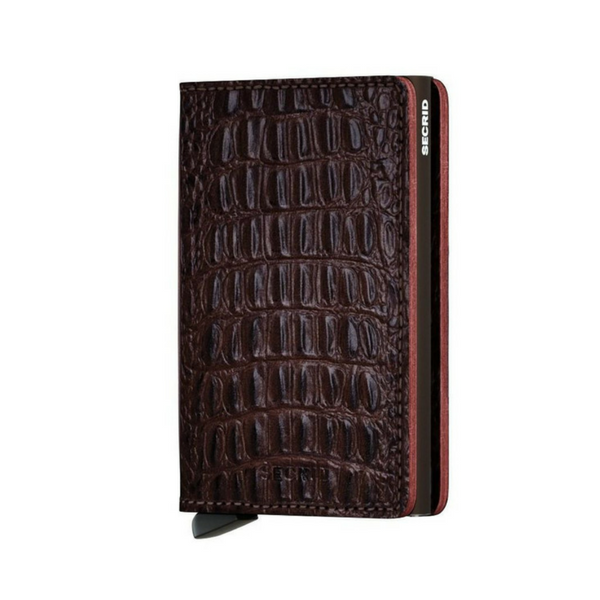 The iconic Secrid Nile Brown Slim Wallet is the slimmest, compact, stylish, and the best secure slim wallet online. Secrid produces high-quality slim wallets in a wide variety of colors & styles. Even though the wallet is slim, there is ample space for cards, paper money, receipts, and business cards. The patented cardslide mechanism of unique slim wallets allows you to access your cards in one simple and smooth motion. Every secrid slim-wallet has an aluminum casing that protects your credit card information and privacy and keeps you safe from digital pickpockets.