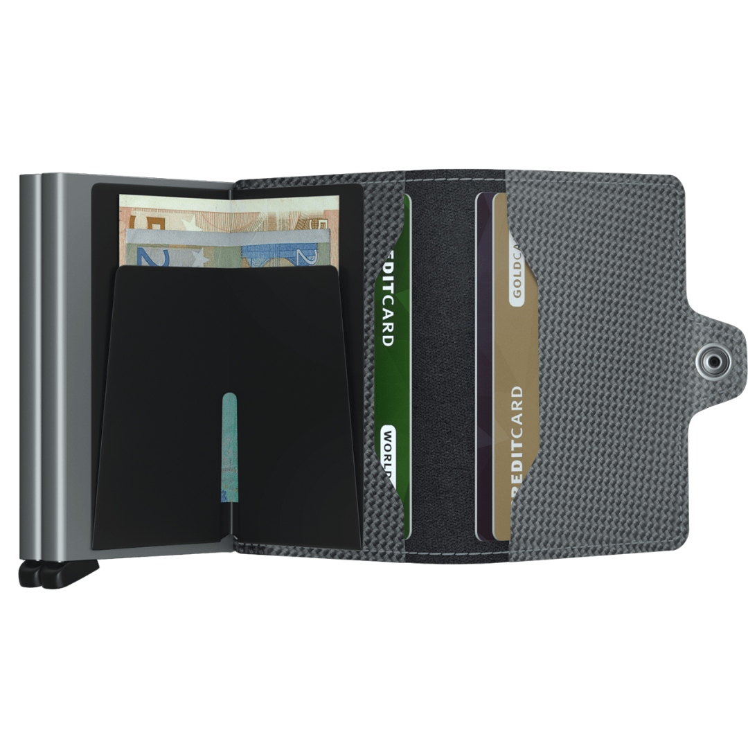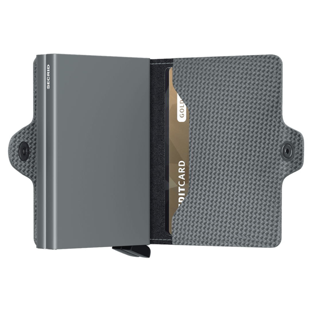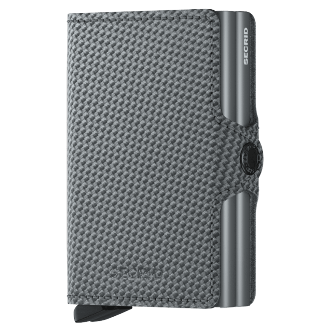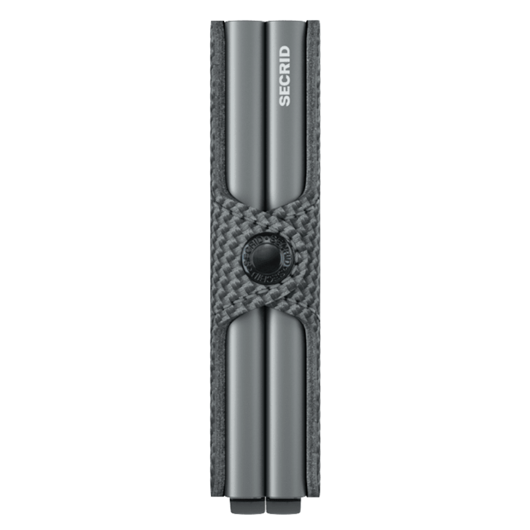 With two Cardprotectors to hold double the content, the Twinwallet carries up to 16 cards, banknotes and receipts, but remains compact in size. The patented mechanism allows you to slide out your cards with one simple motion, ready for immediate use. The aluminium protects from bending, breaking and unwanted wireless communication. Carbon The Twinwallet Carbon Cool Grey has a weave pattern. The weave pattern of carbon fibres inspired this treatment of the leather surface. Carbon is made in Germany from European cowhide. For more information on leather characteristics, our production process or care instructions, visit our leather page. Holds: 8 embossed or 12 flat cards 4 extra cards Banknotes Business cards Receipts Size and weight: 70 x 102 x 25 mm 130 g