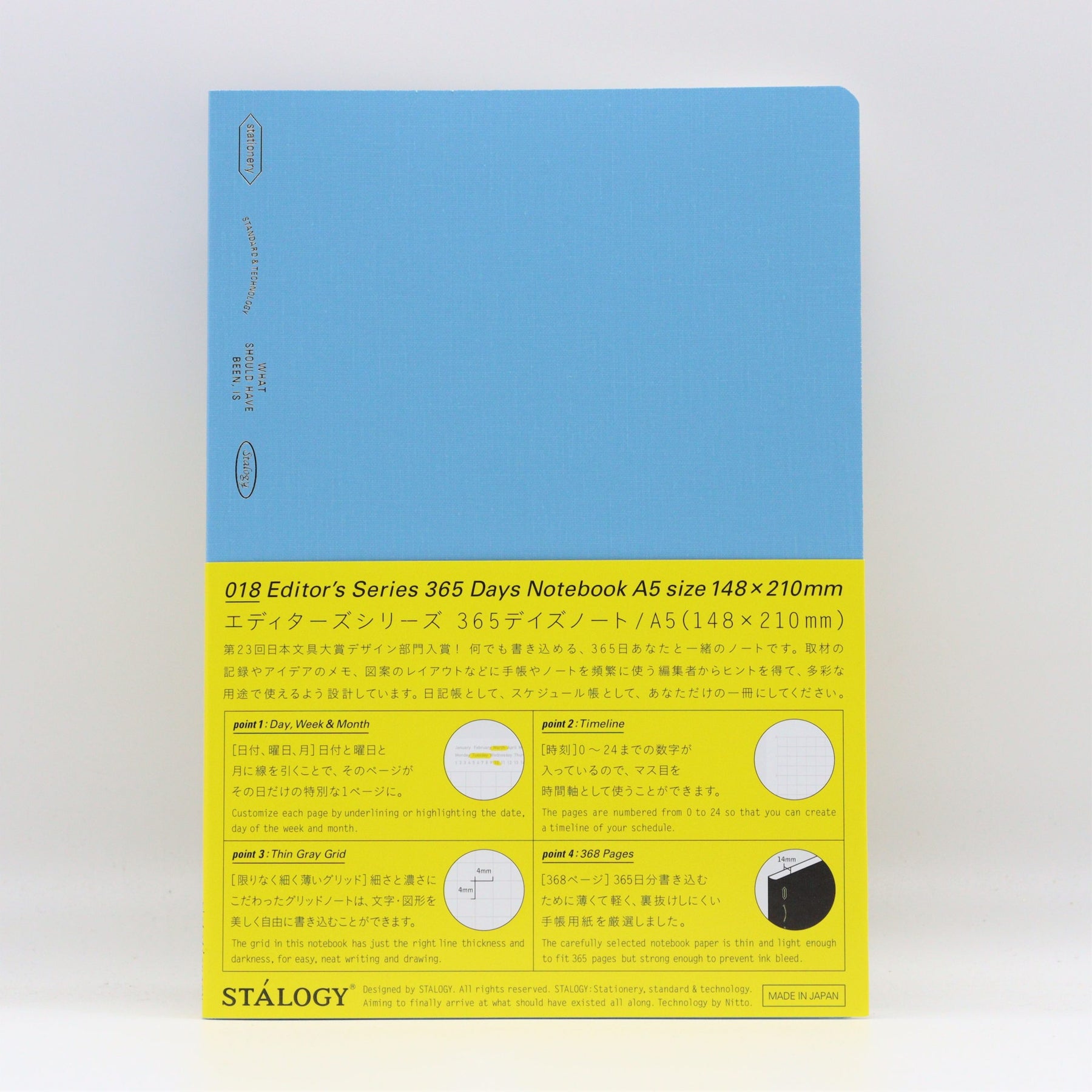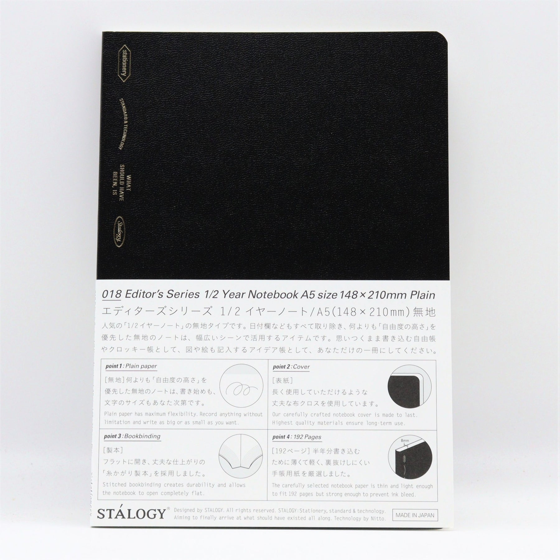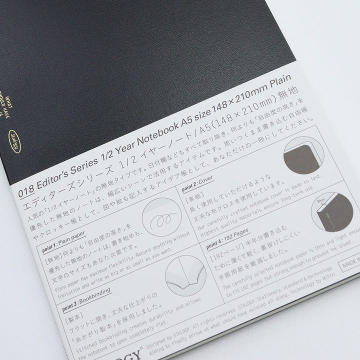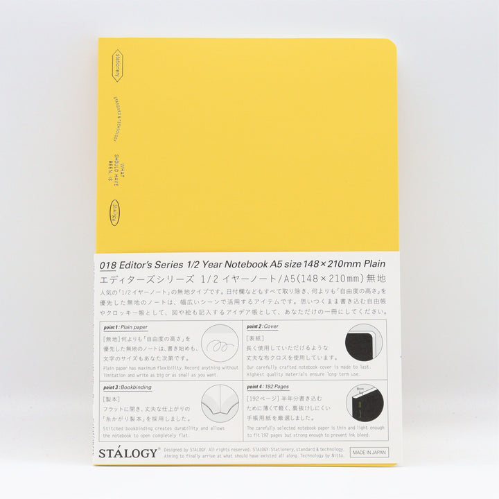 Size: A5 Size in cm: 21.0 x 14.8 Binding: Stitched 192 sheets Type: Plain Available colors: Black, Blue, Red, and Yellow *Fountain pen friendly paper