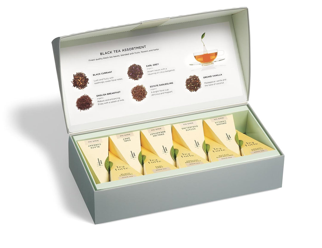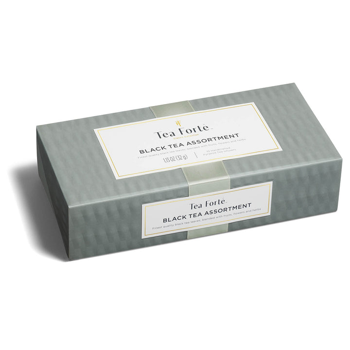 Finest quality black tea leaves, blended with fruits, flowers, and herbs. The Black Tea Tasting Assortment Presentation Box contains 10 pyramid infusers, two each of the following Black tea blends: