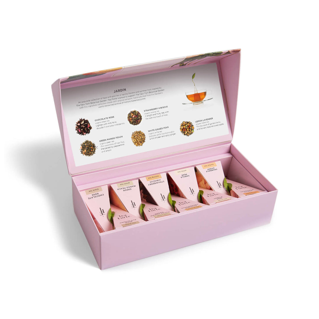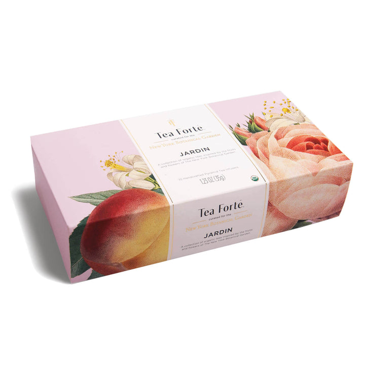 Our limited-edition Jardin Collection brings forth an elegant assortment of organic teas curated in collaboration with The New York Botanical Garden (NYBG). With designs hand-picked from NYBG's collection of rare floral prints, this sophisticated collection includes five organic tea blends, each packaged with a custom botanical artwork meant to inspire enjoyment from first glance to last sip. A percentage of sales of this collection will support NYBG’s work in plant research and conservation, horticulture, and education, making this an ideal gift for any lover of fine tea, art and nature. This box contains 10 pyramid tea infusers, 2 of each blend: Chamomile Citron (Herbal), Chocolate Rose (Black), Green Mango Peach (Green), Strawberry Hibiscus (Oolong), and Vanilla Pear (White).