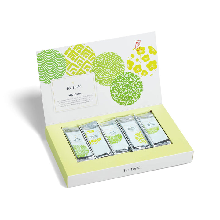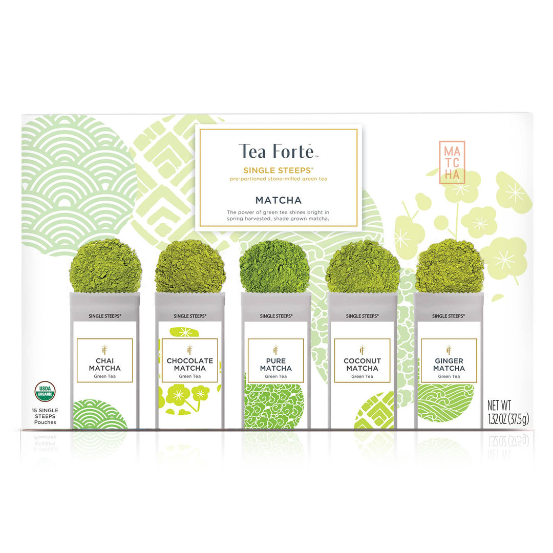 Adhering to the centuries-old Japanese art of practice and perfection, our spring-harvested and shade-grown matcha delivers bountiful health and enlivening energy. Our Matcha Single Steeps® makes it easy to take on the go. Each box contains fifteen single-serve, stay-fresh pouches, three of each blend: Chai, Chocolate, Coconut, Ginger and Pure.