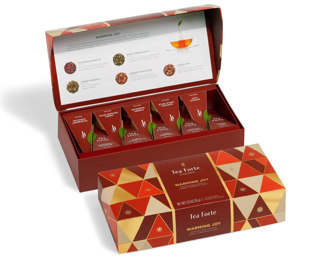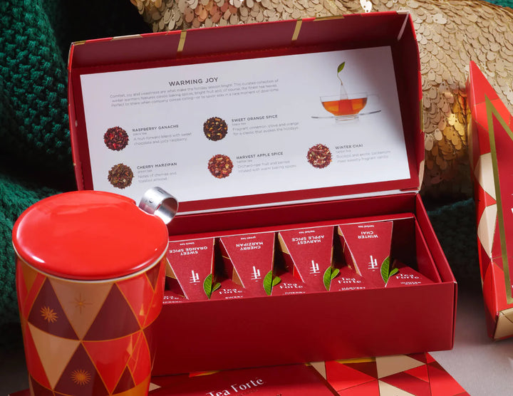 The open lid reveals a detailed tasting menu on the inside lid and 10 festive teas, two of each blend: Raspberry Ganache, Sweet Orange Spice, Cherry Marzipan, Harvest Apple Spice and Winter Chai. Pairs perfectly with our Café Cups. All teas in this collection are Kosher Certified.