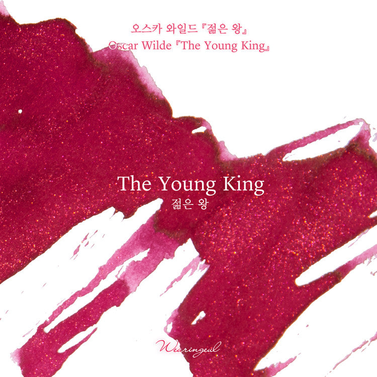The Young King ink features a vibrant magenta-red base with subtle coppery-red glitter, symbolizing the hidden lives of common people beneath royal opulence. The rose-gold shimmer adds a touch of elegance, shifting to yellow or silver tones depending on the angle.