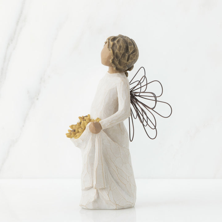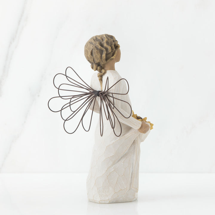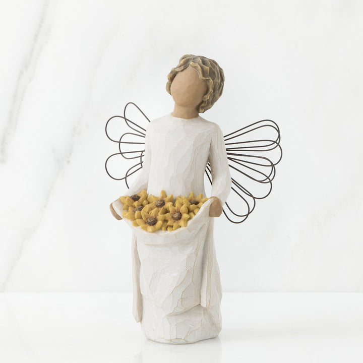 The Willow Tree Sunshine figurine is an angel with wire wings. It carries sunflowers in its dress, bringing light, joy, and happiness to any space. Brighten up your or a loved one's day with this special gift. Also perfect for those who love flowers.