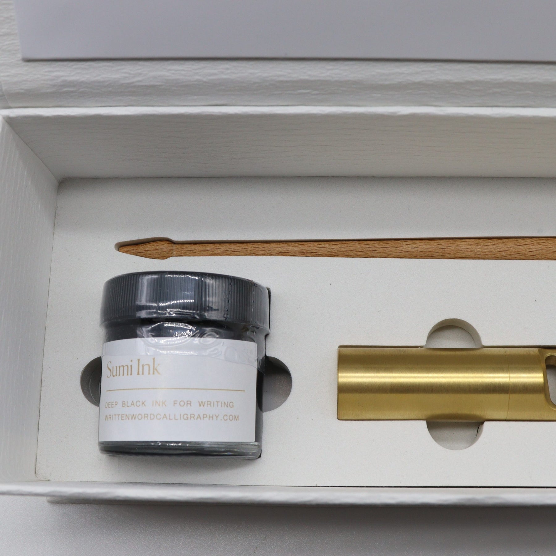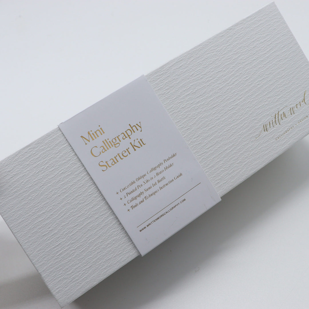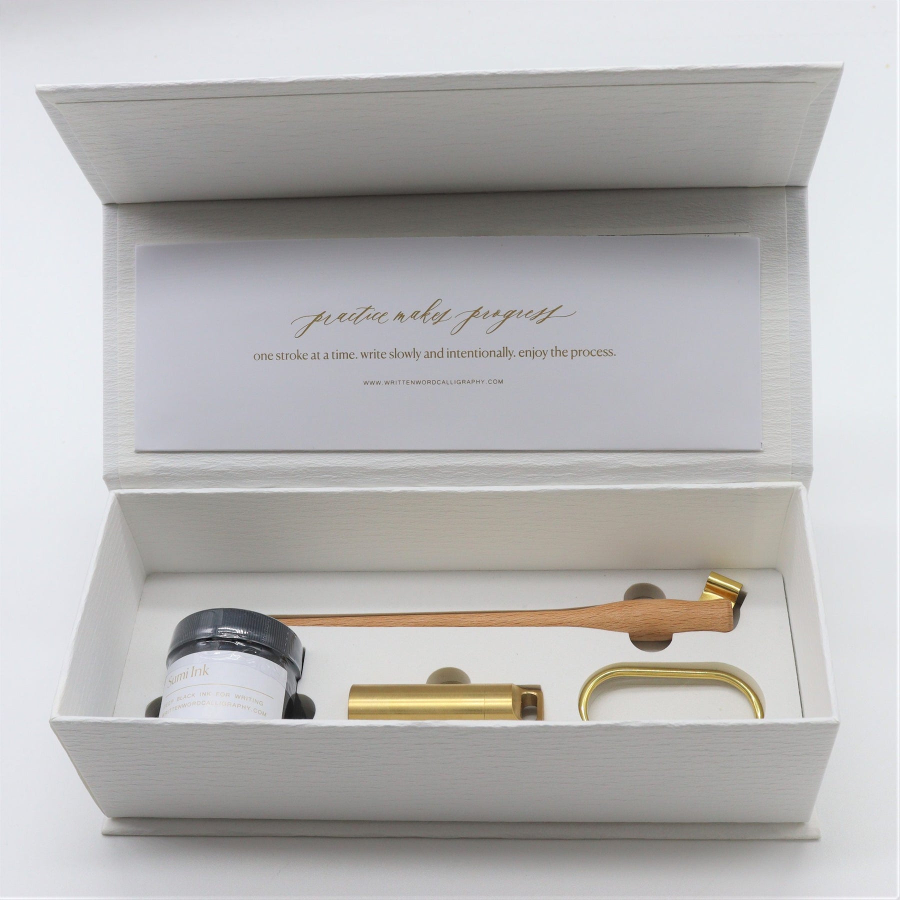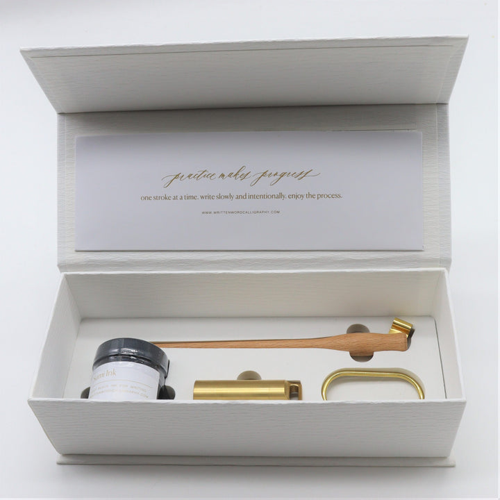 The WRITTEN WORD mini calligraphy kit features a set of calligraphy essentials such as a calligraphy pen, nib holder, nibs, ink, and a starter kit guide with instructions. It is the perfect gift for yourself or your calligraphy-loving friend. The kit includes the following: